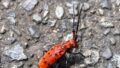 同じく赤いカミキリに「ホシベニカミキリ」がいますが、こちらは羽根に黒い斑点(ほし)があるのが特徴で、食草(幼虫の食べる植物)もクスノキ科の樹木でベニカミキリとは異なります。